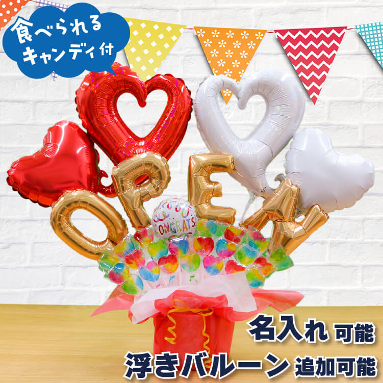 開店祝いのOPENバルーン電報開店やオープンをお祝いするバルーン・キャンディーブーケです。店舗や事務所へお贈りする開店祝いのプレゼントやオープン記念のギフトにはバルーン電報がおすすめです。食べられる本物の...