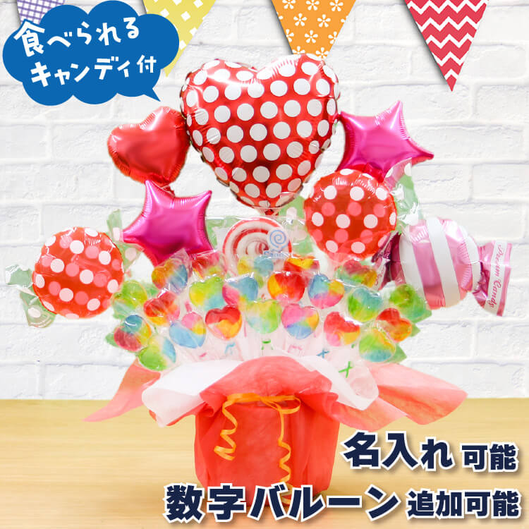 ピンクドットハートとキャンディ☆小粒タイプピンクのハート形にドットがキュートなキャンディブーケです。キャンディ型のバルーンやペロペロキャンディがお祝いを盛り上げます。小粒のキャンディは、食べら...