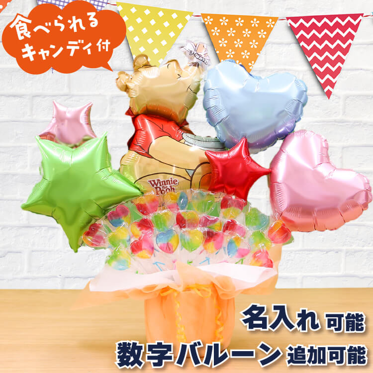 クマのプーさんのキャンディーブーケ大人気!プーさんがお祝いしてくれるバルーンです。お子様の誕生日プレゼントはもちろん、ウエディングや二次会に贈る電報や、開店のお祝いなど様々な場面で活躍してくれます。食...