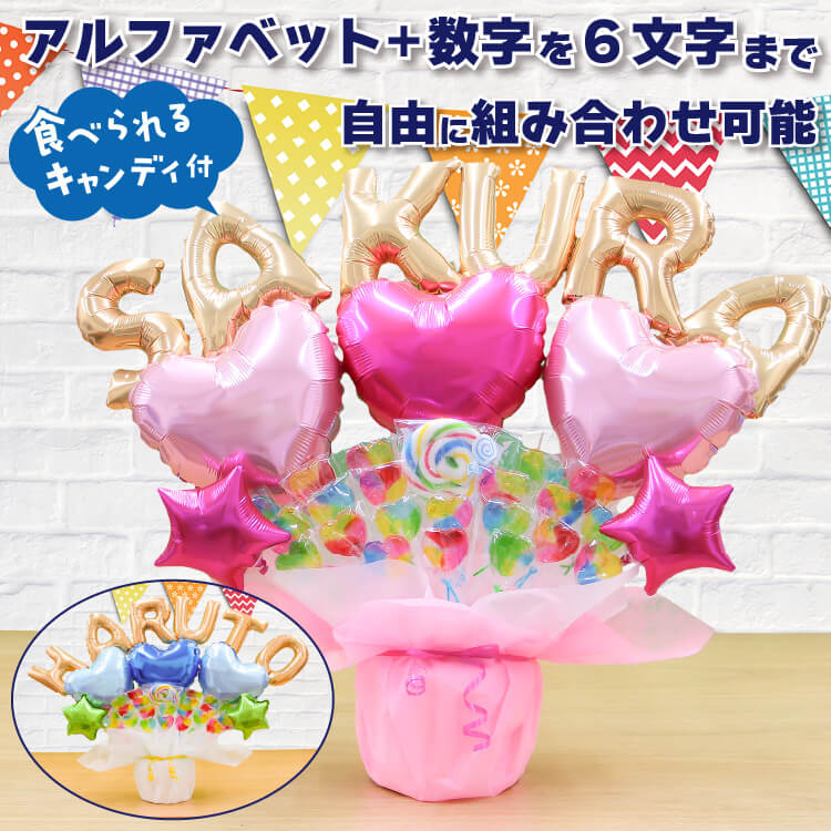 アルファベットと数字のバルーンを自由に組み合わせたオリジナルキャンディブーケ ピンク ブルー 文字バル