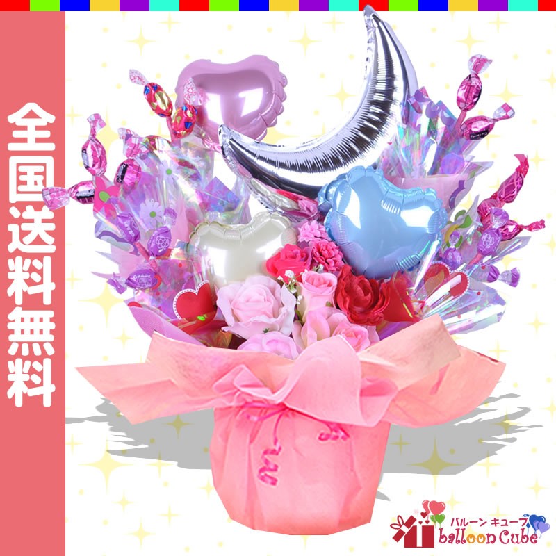 シルバームーンのキャンディブーケ☆小粒タイプムーンバルーンがかわいいキャンディーブーケです☆ピンクのキャンディやお花の中で、銀色に輝く三日月がキュート☆小粒のキャンディは、食べ...