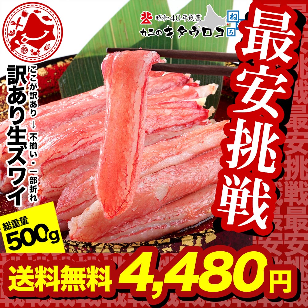 生食可のお値打ち品! 訳あり 生 ずわいがに 棒肉 ポーション 500g サイズ不揃い 一部折れあり 蟹 ズワイガ