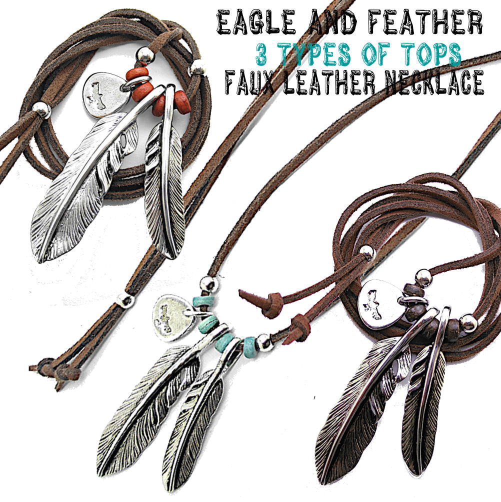 メンズ ネックレス フェザー 2枚 羽根 複数トップ イーグル ペンダント チョーカー フェイクレザー 人工皮