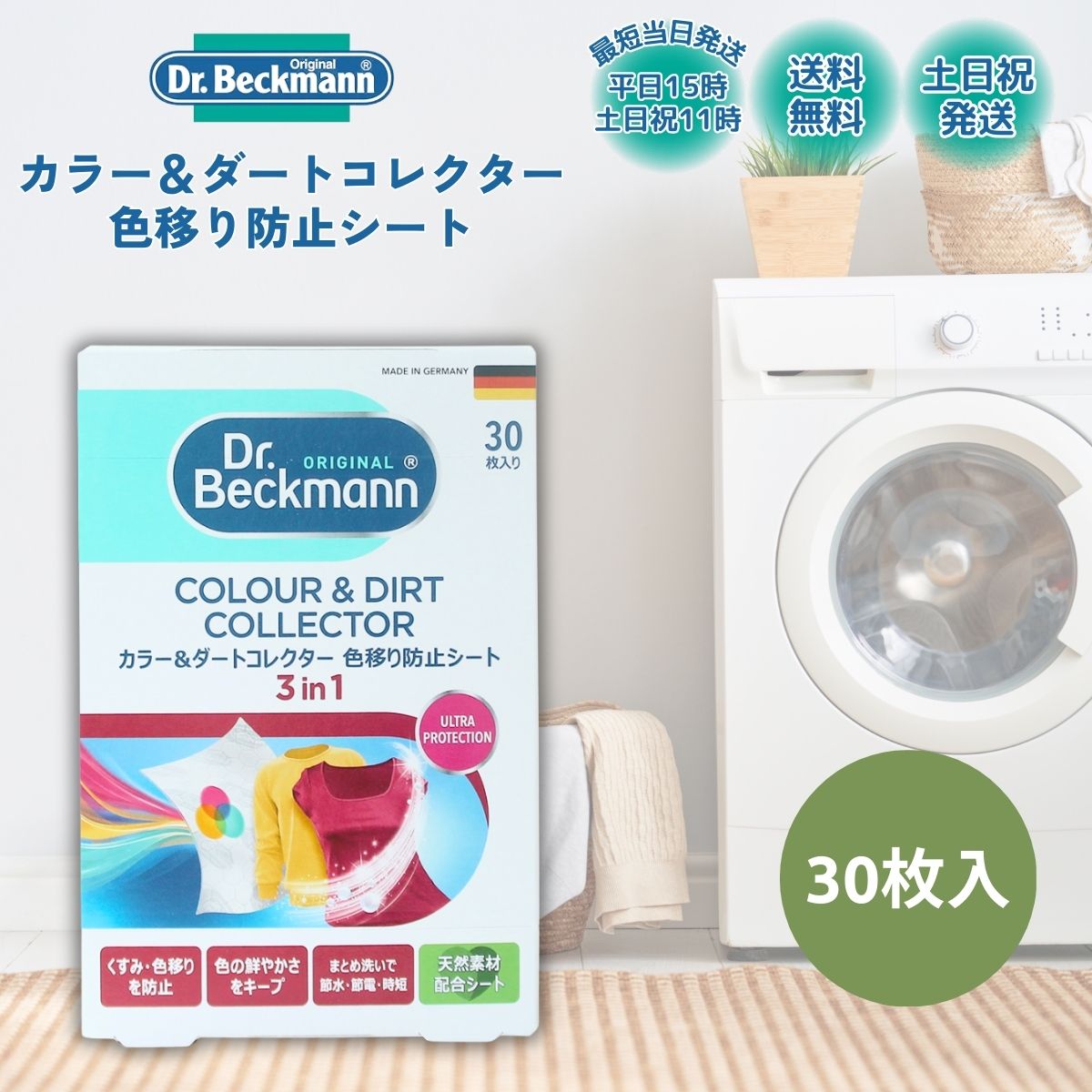 色移り防止シート ドクターベックマン 30枚 カラー&ダートコレクター 洗濯シート 色移り 節水