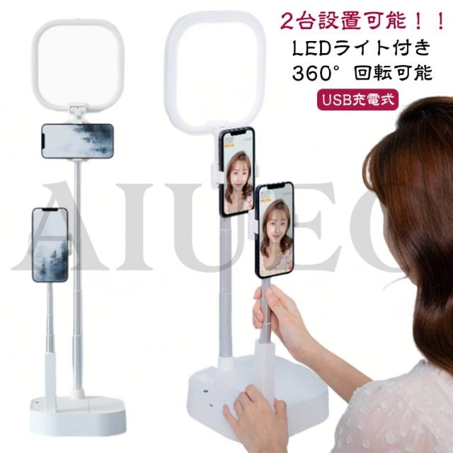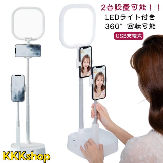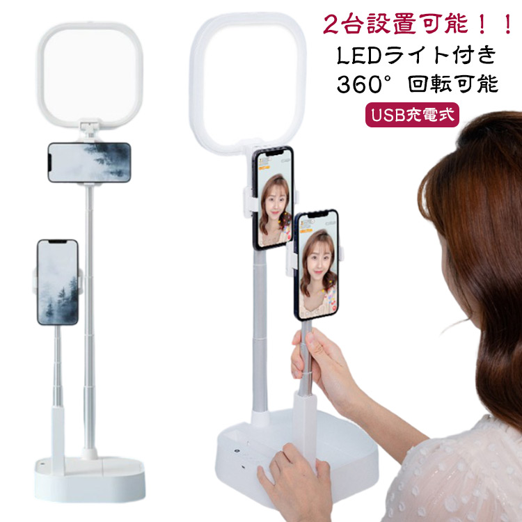 ライト 自撮りライト 2台設置 上 スマホスタンド から usb 付き 充電式 多機能 卓上 セルフィースティック