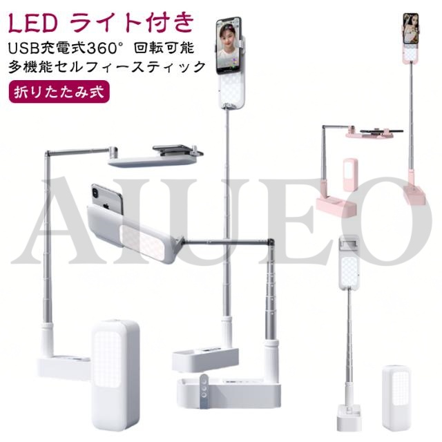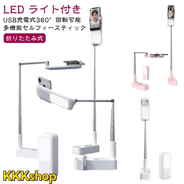 2台設置 usb LED 多機能 スマホスタンド ライト 収納バッグ付き 付き セルフィースティック 充電式 収納バ