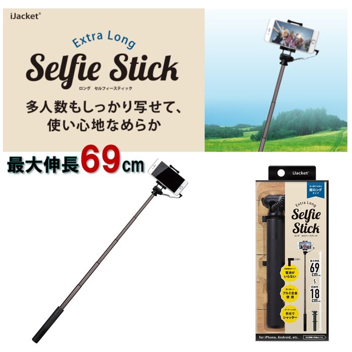 自撮り棒 じどり棒 自撮り iPhone Android アンドロイド セルフィースティック ロング最大69cm ブラック PG