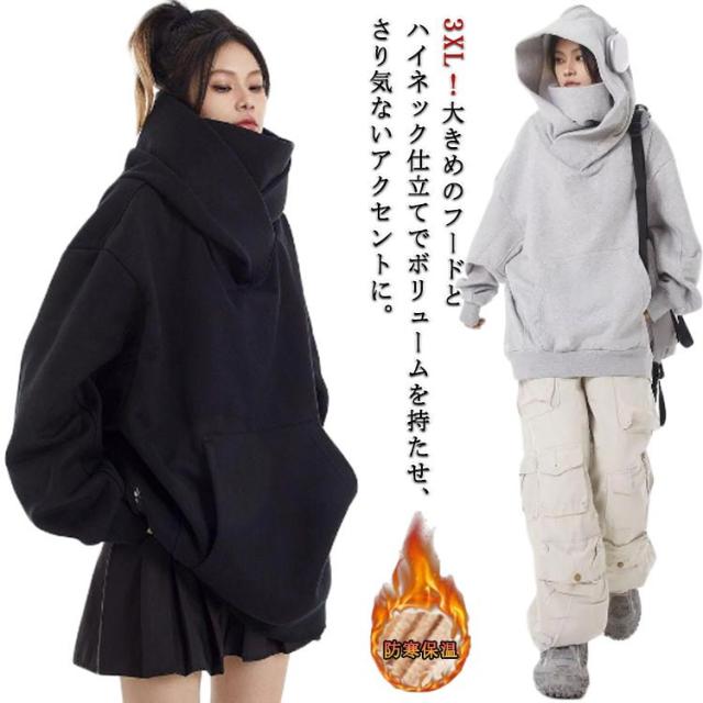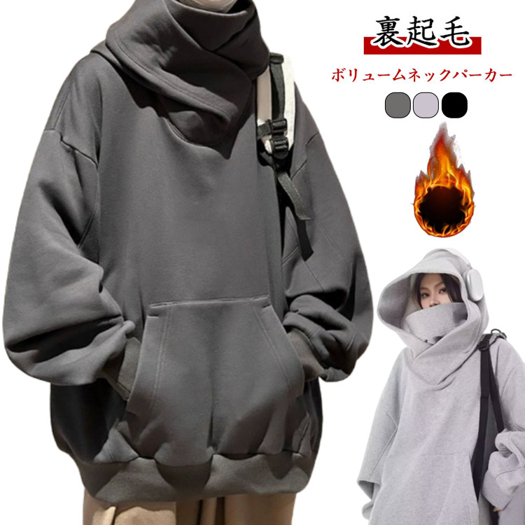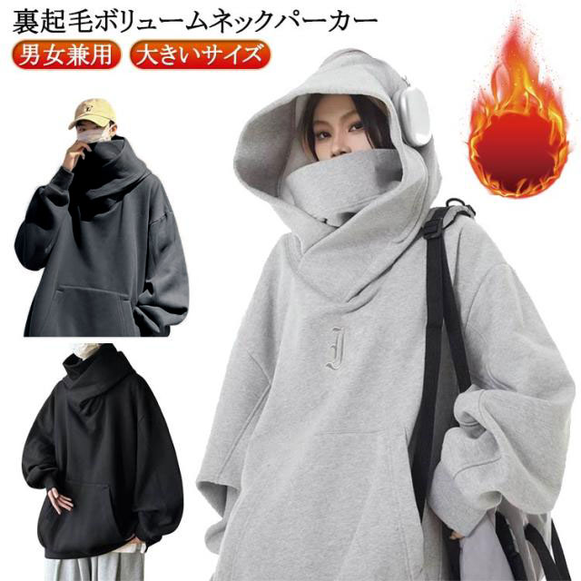 ボリュームネックパーカー レディース プルオーバー 保温 裏起毛 機能的 男女兼用 パーカー メンズ ゆった