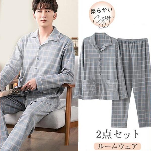 ルームウェア 部屋着 パジャマ メンズ セットアップ 大人 シンプル 春 秋 寝巻き 長袖 前開き 上下セット