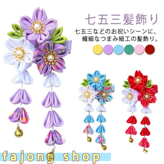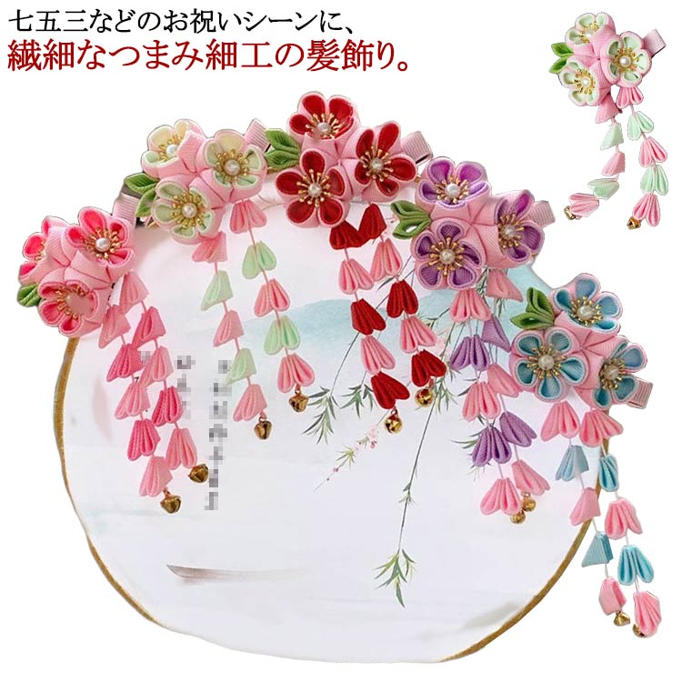 JZOON 七五三 髪飾り つまみ細工 式 七五三 浴衣 袴 着物 振袖 和装 花 卒業式 結婚式 桜 鈴付き 753 六色