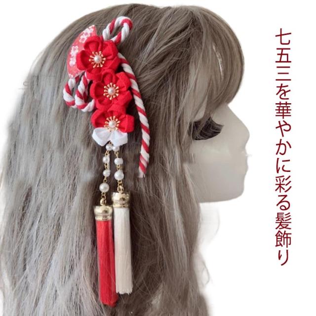 七五三 髪飾り 着物 つまみ細工 753 ぶらさがり付 ダリアと水引飾り 和装 女の子 3歳 7歳 タッセル 赤 ピン
