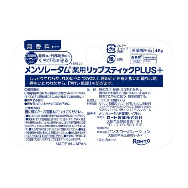 ロート製薬|ROHTO メンソレータム 薬用リップスティックプラス 無香料 4.5g・・・