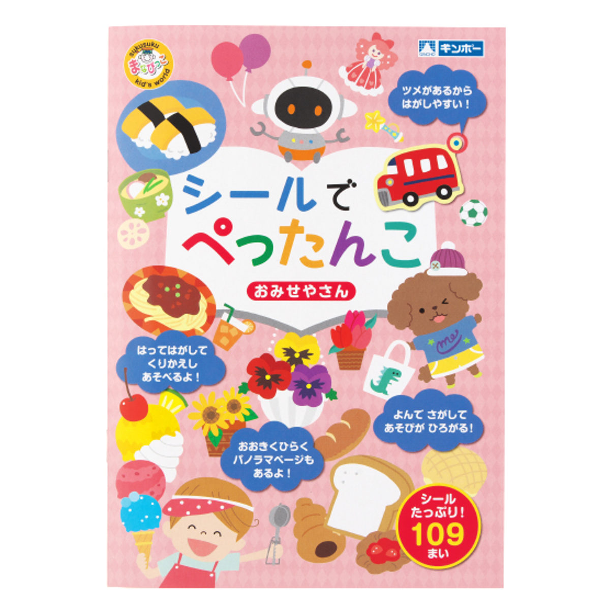 サイズ/約幅15.8×奥行0.5×高さ25.3cm内容量/本体、シール109枚材質/本体・シール:紙生産国/日本製対象年齢/1.5歳以上●貼ってはがして繰り返し遊べる「シールでぺったんこ」シリーズの「おみせやさん」です。●シールは剥がしやすくするために、持ち手(ツメ)が付いています。●ツメを内側に折りこんでおくと、何度でも貼ったり剥がしたりがスムーズにできます。●コンパクトで持ち運びに便利なサイズです。教育 勉強 幼児 繰り返し遊べる 男の子 女の子 おけいこ ごっこあそび シール遊び はってはがせる シールあそび シールえほん シール帳 室内 室内遊び 幼稚園 保育園 練習 こども キッズ 1.5才 2才 3才 1.5歳 2歳 3歳 景品 プチギフト 贈り物 ギフト 子供会 子ども会 こども会 クリスマス会 誕生日会 食べもの ごはん 銀鳥産業 ギンポー オモチャ しーる 読み聞かせ 持ち運び アイスクリームやさん ケーキやさん おすしやさん けーき お寿司 LH9297 LH9294