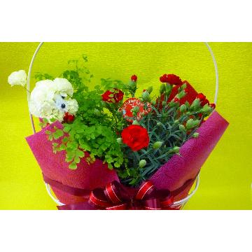 可愛いトイプーさんがメインの母の日向けアレンジです♪大きなカーネーションとスプレーカーネーションがプードルさんを囲んでます^^