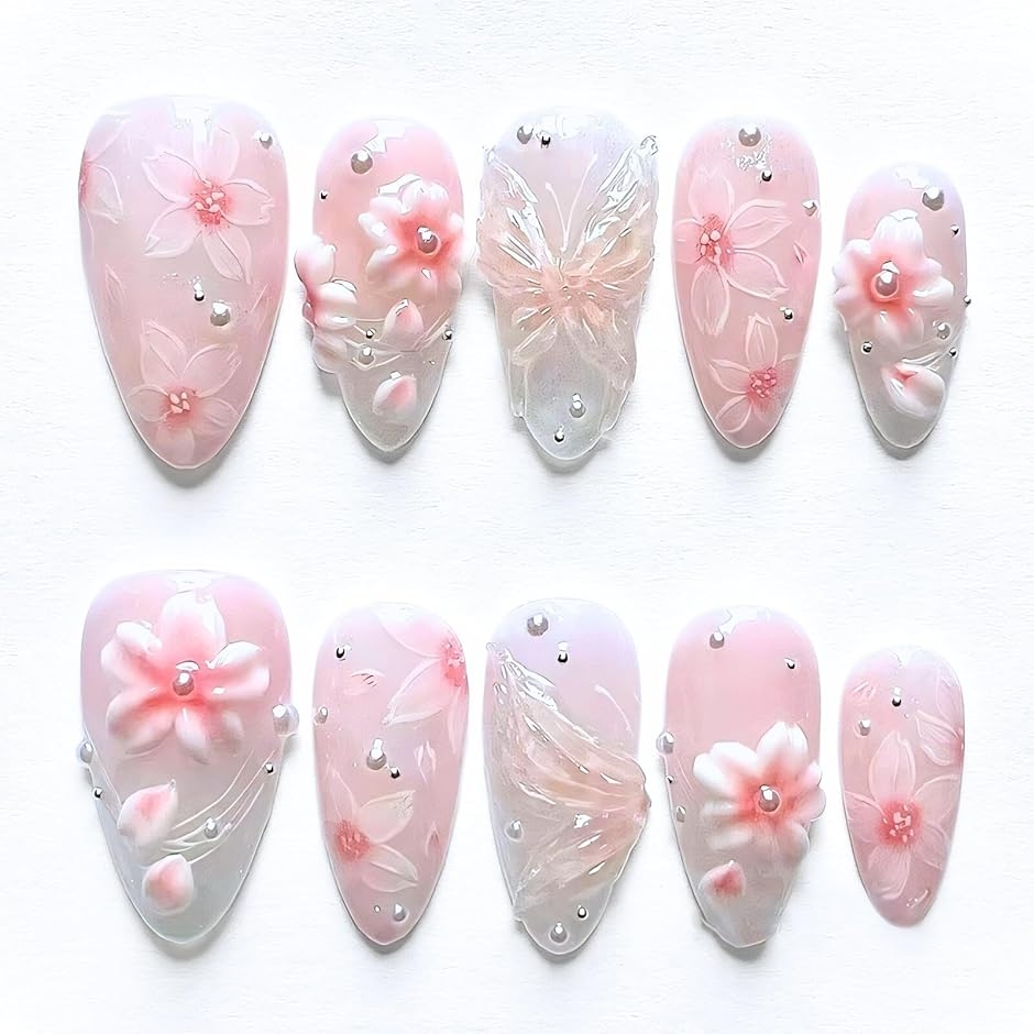 ネイルチップ 桜 チークネイル ミディアム ポイント 立体桜 パール ラインアート ピンク 24枚入り 卒業式 (ピンク, ミディアム)