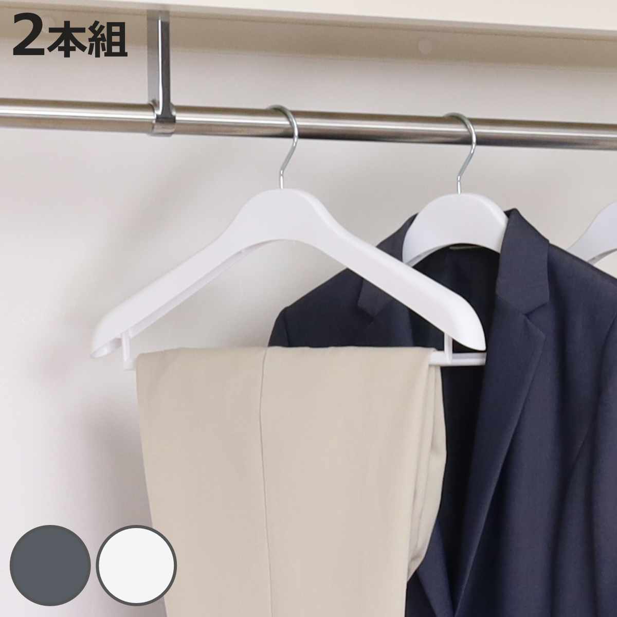 サイズ/約幅41×奥行3.2×高さ23cm重量/約102g内容量/2本組材質/本体・バー:ポリプロピレンフック:スチール滑り止め:TPR種類/ロックグレー、スノーホワイト生産国/ベトナム製●肩幅約42cmのフォーマルハンガーです。●2本組です。●スラックスバーが付いているので、ズボンやスラックスを収納できます。●スラックスバーにはすべり止めが付いているので、ズレ落ちを防ぎます。●上下揃えて掛ける事ができるので、スーツなどの収納におすすめです。●フックは回転します。●使いやすく、収納効率を追求した「ハンガーギャラリーシリーズ」です。ジャケットハンガー スーツ用ハンガー2本 すべり止め バー付き 型崩れ防止 グレー ホワイト 洋服ハンガー 衣類ハンガー 収納 プラスチックハンガー 回転式 回転 フック プラスチック 室内干し 2本組み バー付 メンズ レディース メンズスーツハンガー ビジネススーツ用 スーツ用 ジャケット パンツ スラックス ズボン ボトム ボトムス セットアップ 上下 上下セット 紳士 紳士服 婦人服 滑り止め 落ちない ズレ落ちない ズレ落ち防止 シンプル モノトーン 白 灰 おしゃれ お洒落 LH16269