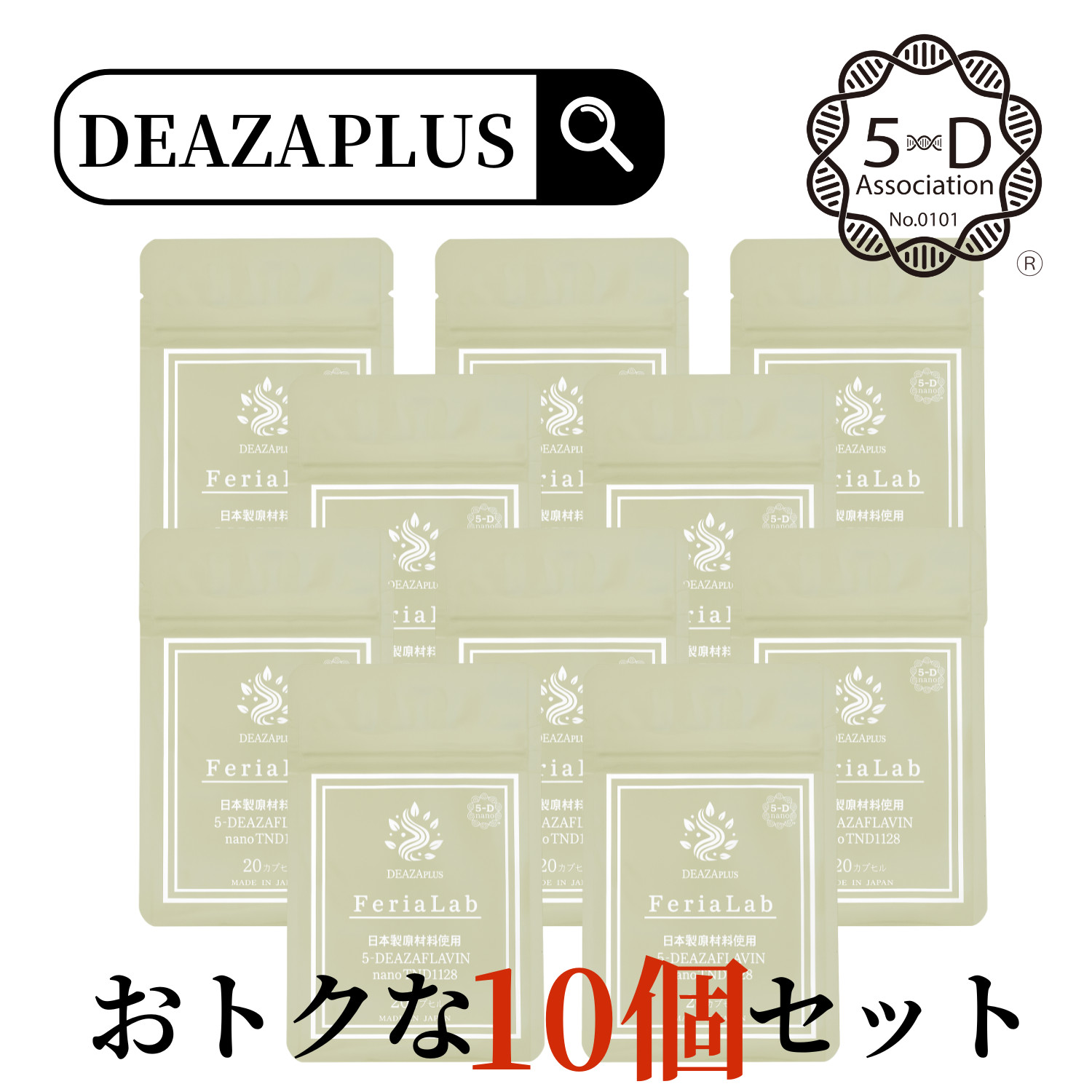 【配合】5-デアザフラビン(TND1128)を配合した次世代エイジングケアサプリです。【安心安全】国内GMP認定工場で製造され、動物性原料不使用です。カプセルには植物性皮膜を使用しています。【ナノ化特許】ナノ化することにより腸への吸収率が大幅アップ。【イキイキとした毎日に】5-デアザフラビはNMNの40倍。ミトコンドリアを元気に。【5デアザフラビンはこんな方にオススメ】エイジングケアされたい方、いつまでも綺麗な自分でいたい方、最新の美容サプリを探している方、元気な毎日を送りたい方へオススメ!*1日1〜2カプセル=1日ナノ化した5-デアザフラビン30mg 〜 60mg【摂取上の注意】○乳幼児の手の届かない場所へ保管してください。○食物アレルギーのある方は原材料名をご確認の上お召し上がりください。○体質や体調によりまれに合わない場合がありますので、その場合は摂取をお控えください。○薬を服用中あるいは通院中の方及び妊娠・授乳中の方は医師にご相談ください。内容量:6.3g(315mg×20カプセル)×10個
