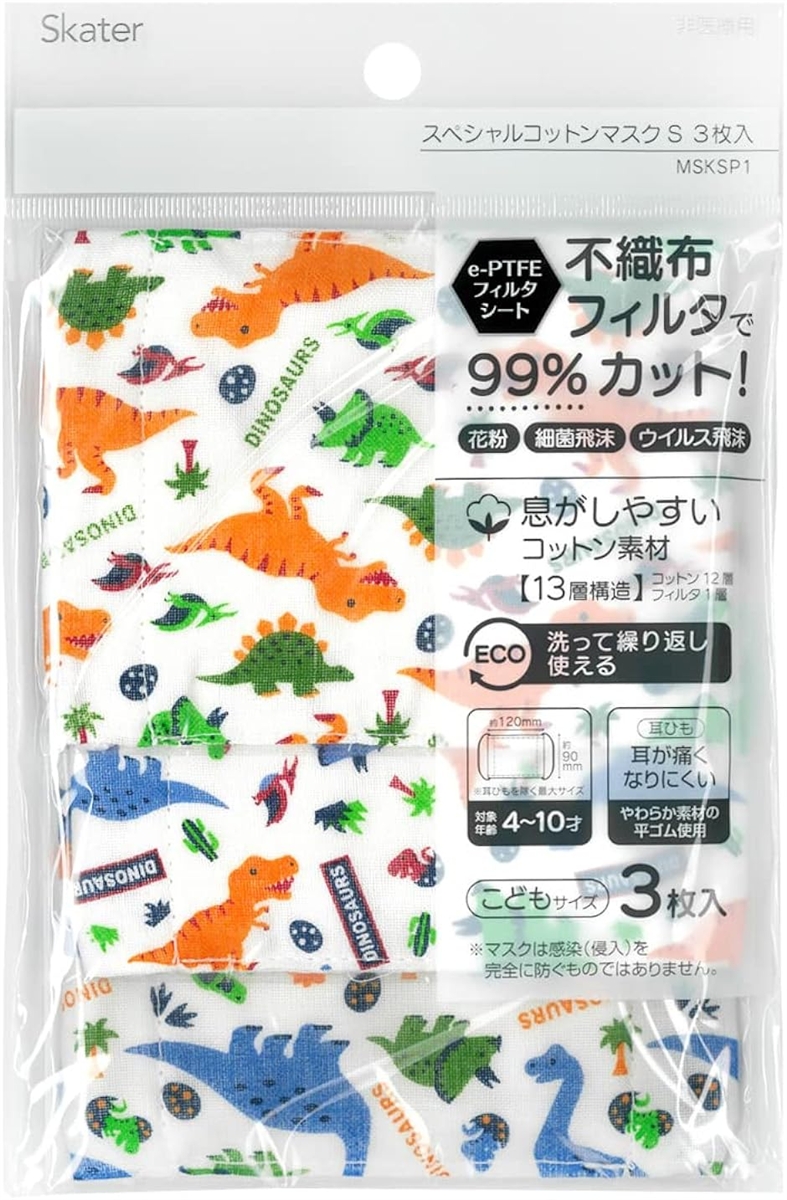 洗える スペシャルコットン マスク 不織布フィルタ 子供用 3枚入 4-10才 MSKSP1-A (ディノサウルス, 12x9cm)