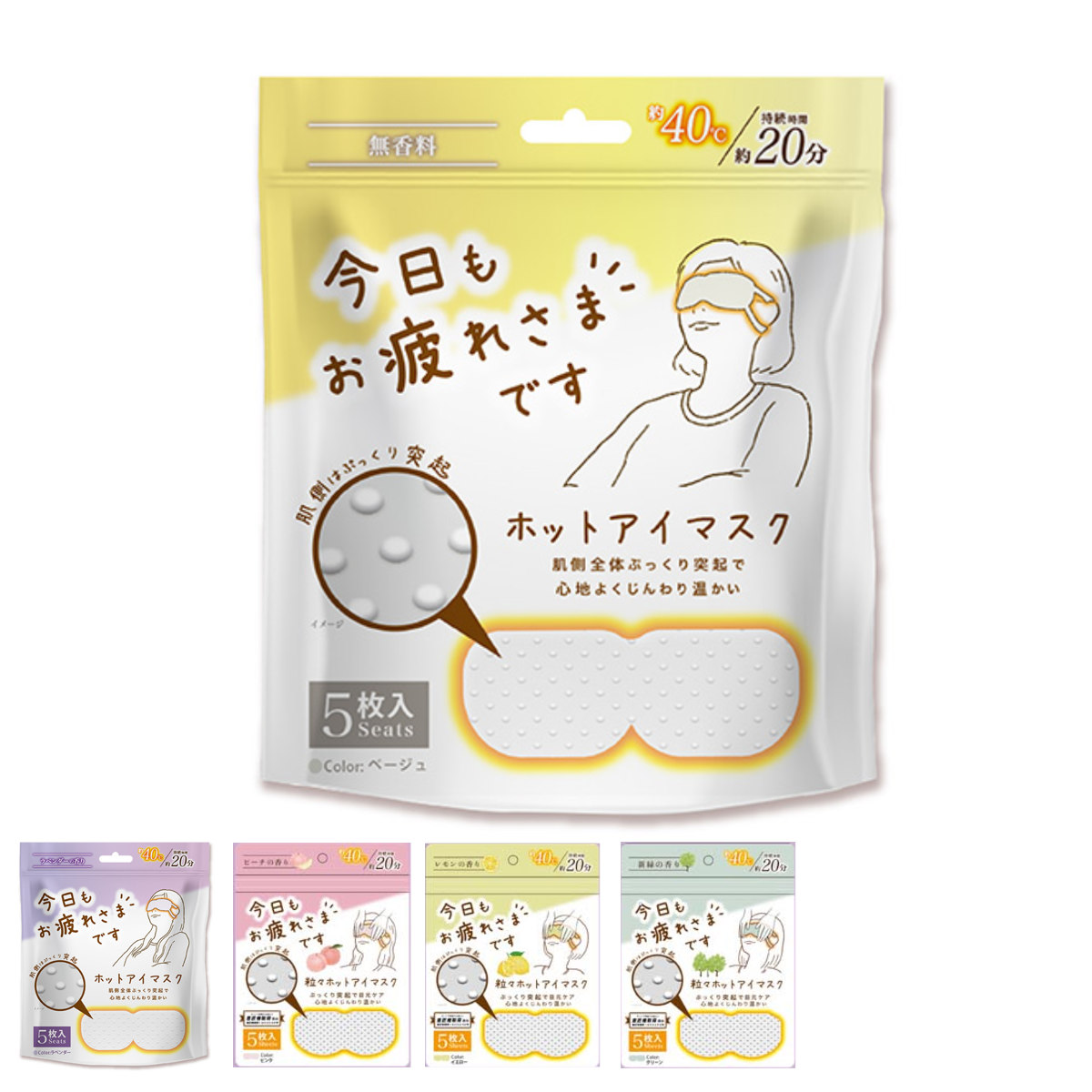 サイズ/約横18.5×縦8cm※耳紐含まない重量/約12g※1枚あたり内容量/5枚入り材質/表地(外側):PET不織布裏地(内側):ポリエステル不織布耳掛け:PP不織布、POE中材:鉄粉、水、バーミキュライト、活性炭、塩類種類/ベージュ、ラベンダー、ピーチ、レモン、新緑●就寝前に、仕事終わりに、疲れた目元をじんわり温めて、リラックスタイムをサポートします。●ぽこぽこ突起でじんわりとした心地よさを感じることができます。●約40度の温かさが20分程持続します。●耳紐部分は痛くなりにくい不織布タイプです。●鼻の形状にフィットする切れ目つきです。●無香料と香り付きから選べるラインナップです。●ちょっとした差し入れやプチギフトにもぴったりです。簡単 プレゼント ギフト 温める 目元 オフィス 自宅 手軽 差し入れ 休憩時間 誕生日 贈り物 暖房 防寒グッズ 冷え対策 冬 アイマスクホット HOT 健康グッズ 寒さ対策 防寒 冷え性 妊活 温活 デスクワーク あったか カイロ 保温グッズ あったかグッズ リラックス ストレス解消 癒しグッズ おすすめ オススメ 父の日 母の日 友達 職場 家事 育児 ベージュ ラベンダー ピーチ LH20806