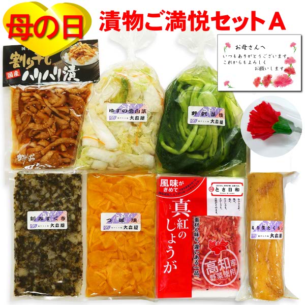 【送料無料 母の日 プレゼント】浅漬けから伝統の漬物まで、ボリュームたっぷり!つけもの好きなお母さんに喜んでいただける安心の国産漬物7品をご用意しました。大森屋で人気のある、思わず箸がすすんでしまうお漬物のセットです。母の日特典として、赤いカーネーションとメッセージカードをお付けいたします。■セット内容: つぼ漬け / 刻みすぐき漬け / 野沢菜 / ゆずの香白菜 / ぬか漬けたくあん / 真紅のしょうが / 割り干しハリハリ漬※状況により、予告なく内容変更する場合がございます。■配送便:クール便