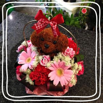 可愛いトイプーさんがメインの母の日向けアレンジです♪大きなカーネーションとスプレーカーネーションがプードルさんを囲んでます^^