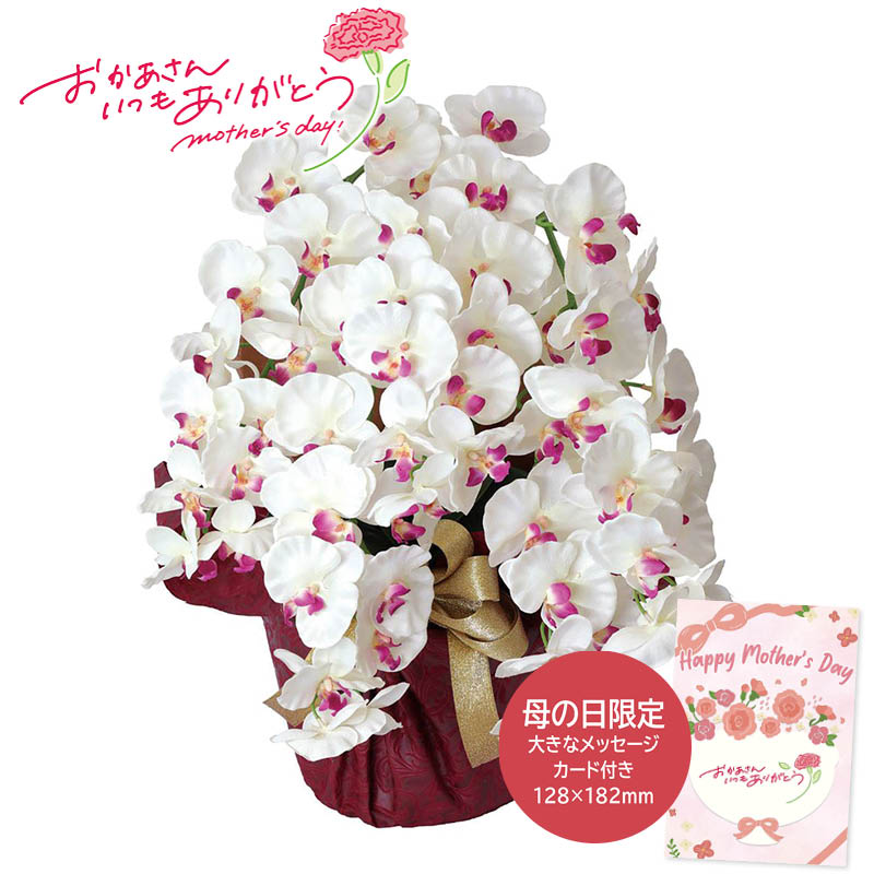 「永遠の美しさで、母の笑顔を咲かせる。」母の日 アーティフィシャルフラワー 5本立ち胡蝶蘭 ホワイトビューティー<おすすめポイント>1.お手入れ不要で長く楽しめる2.どんな空間にも映える美しさ3.特別な日の贈り物に最適母の日 アーティフィシャルフラワー 5本立ち胡蝶蘭 ホワイトビューティーは、お手入れ不要のアーティフィシャルフラワー胡蝶蘭。大輪のホワイトビューティーは、どんなインテリアにもマッチし、特別な日の贈り物に最適です。母の日 アーティフィシャルフラワー 5本立ち胡蝶蘭 ホワイトビューティーは、プレゼント、マイギフトとしてもおすすめです。