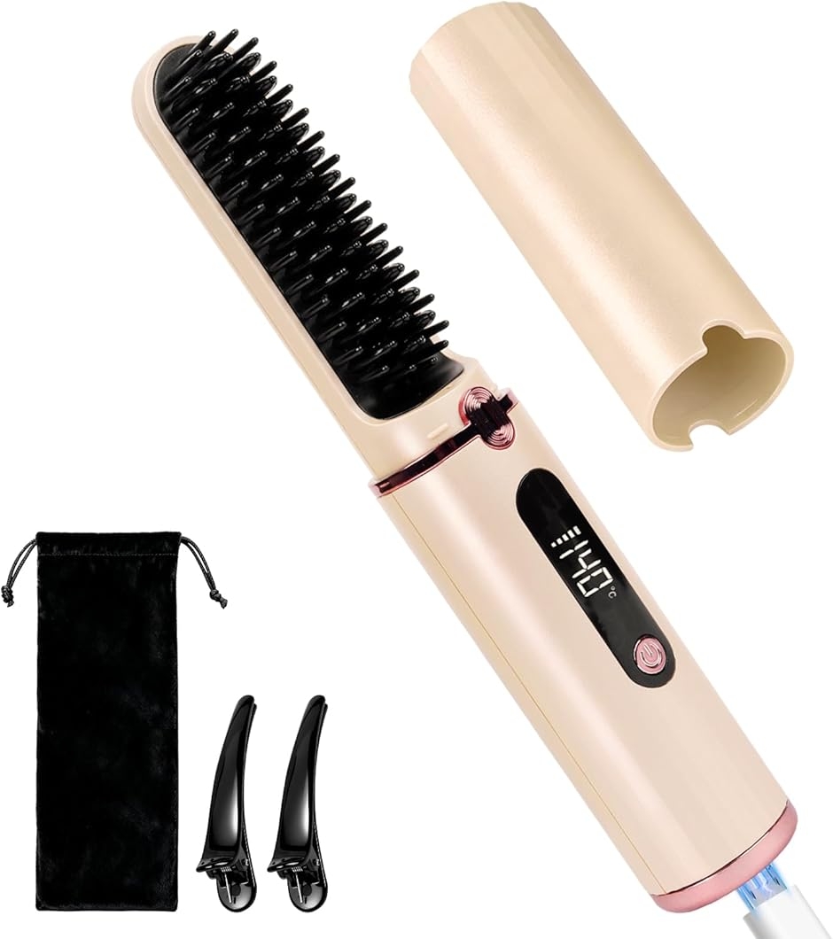 ヒートブラシ コードレス Type-C充電式 ミニ 持ち運び ブラシアイロン 4段階調節 140〜200℃温度調整 (イエロー)