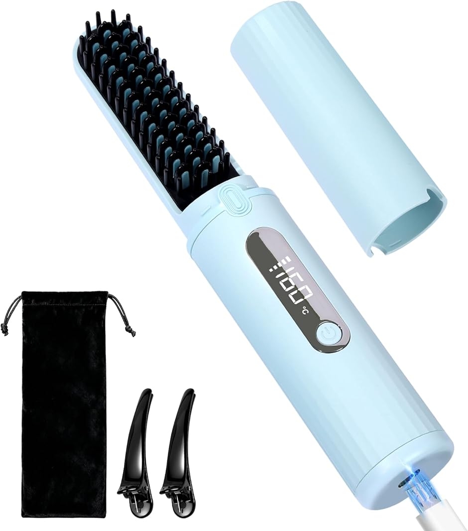 ヒートブラシ コードレス Type-C充電式 ミニ 持ち運び ブラシアイロン 4段階調節 140〜200℃温度調整 コンパクト (ブルー)
