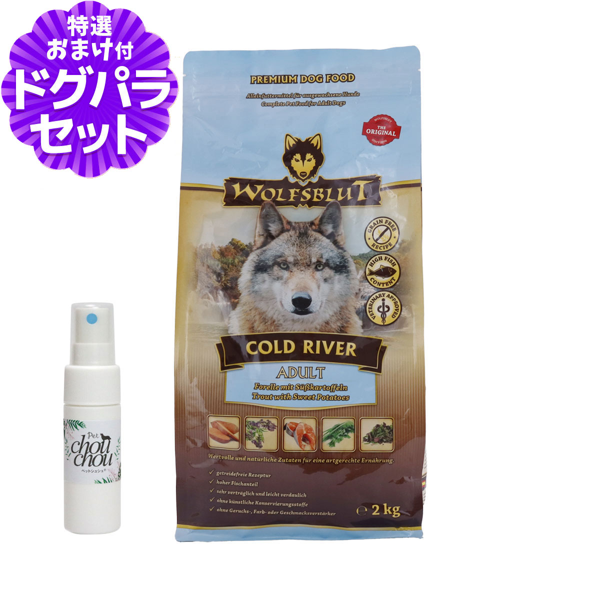 ウルフブラット アダルト コールドリバー(マスとスイートポテト)2kg+天然ハーブ全身ガードスプレー15ml 犬用